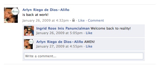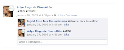I have developed the habit of posting status updates in Facebook. I shared thoughts about going back to work after my 3-month maternity leave,
