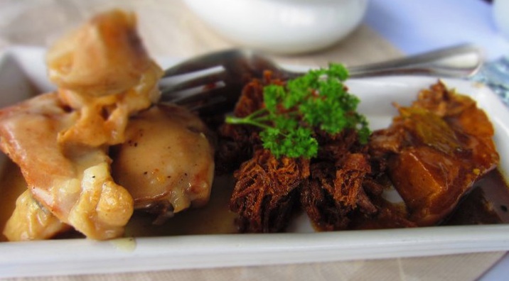 | adobo, 3-ways - chicken sauteed in garlic then simmered in vinegar alone, crunchy yet tender flakes and the famous pork stewed in soy sauce with basil leaves photo by Ingrid Panuncialman |